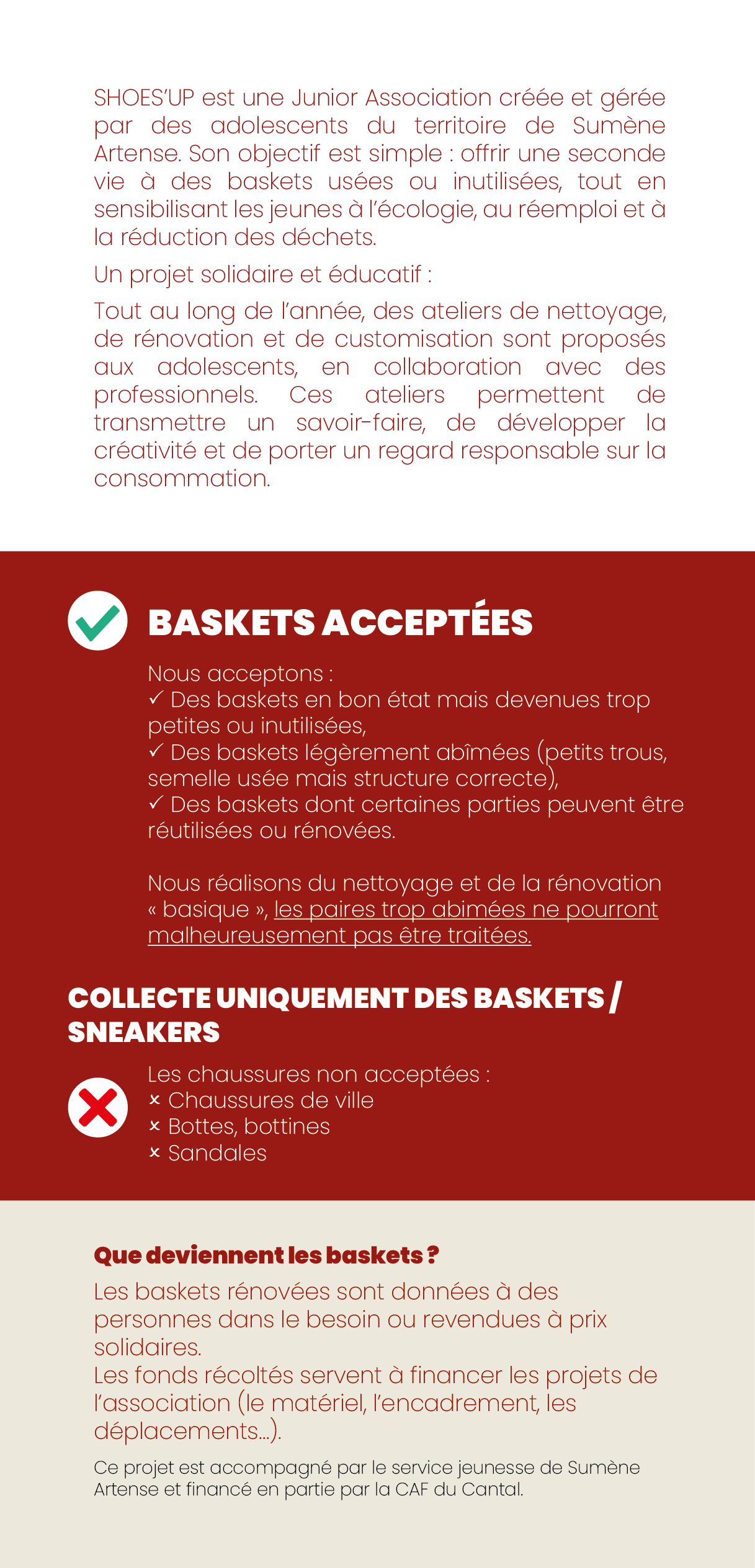 En partenariat avec le service jeunesse Sumène Artense le collège organise une collecte de baskets qui rénovées seront données à des personnes dans le besoin ou revendues pour financer les projets de l'association,pour les modalités cf le flyer joint