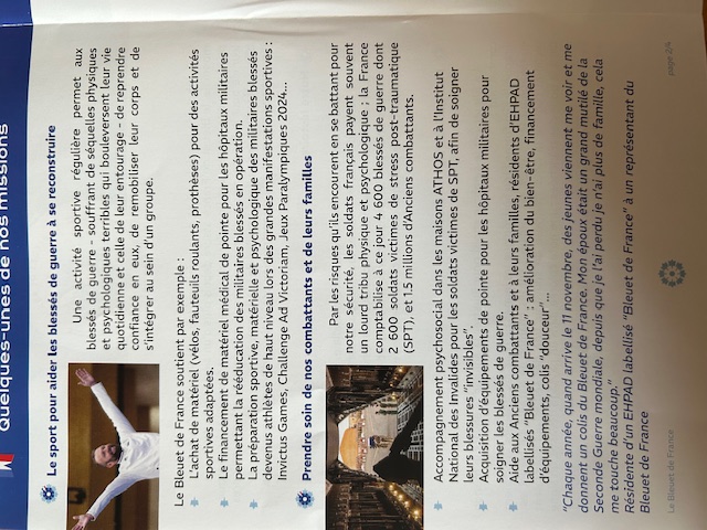 Le Bleuet de France finance des actions de mémoire et de transmission à destination de la jeunesse et des opérations de solidarité envers les militaires blessés.Il assure un soutien psychologique, matériel et financier aux hommes et aux femmes qui ont risqué leur vie pour la France, ainsi qu'à leurs proches (anciens combattants, militaires, blessés, familles endeuillées, pupilles de la Nation.)